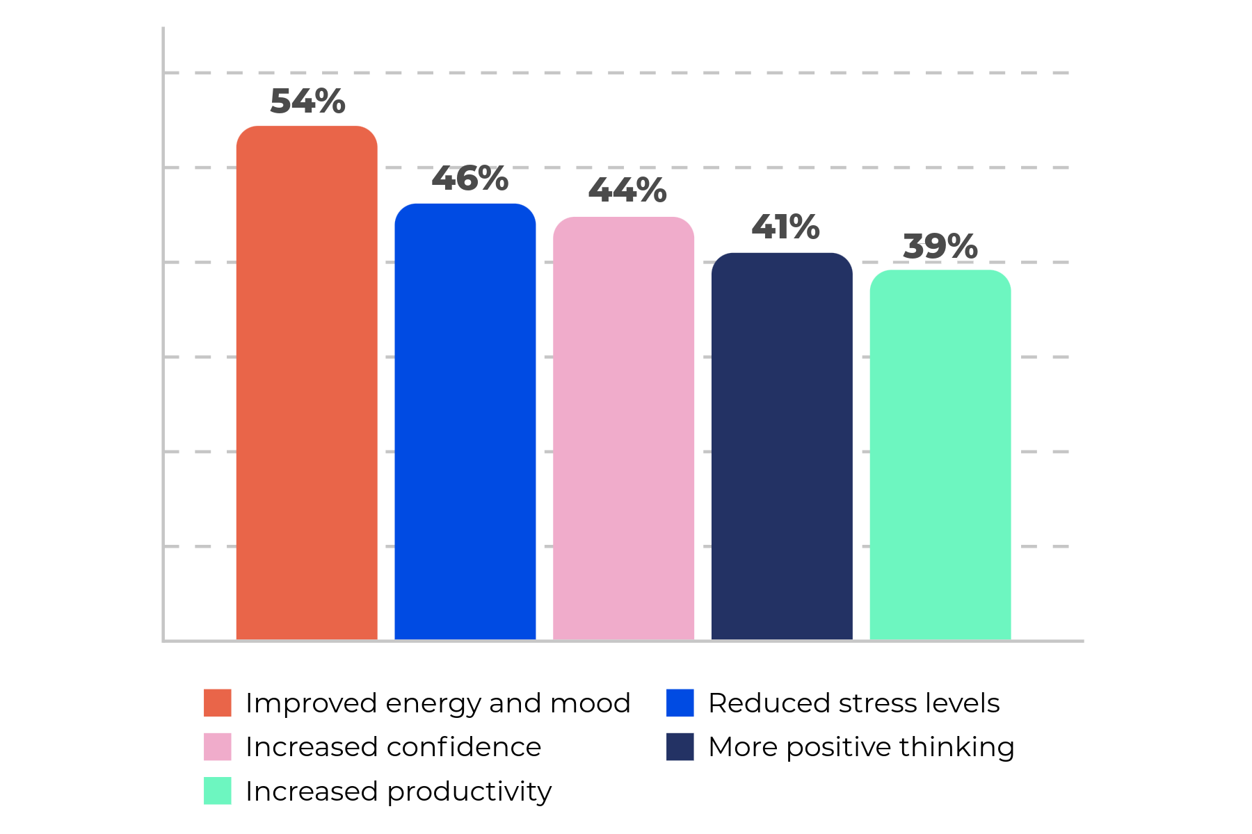 Nearly 9 in 10 (88%) younger employees enjoy working out on their lunch break, with the top benefits they feel include improved energy and mood (54%), reduced stress (46%), increased confidence (44%) & boosted productivity (39%).
